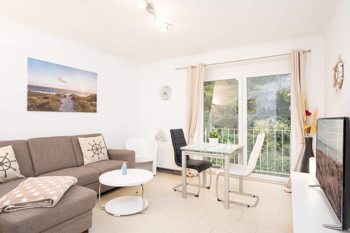 Der Eingangsbereich empfängt Sie mit praktischer Garderobe und führt in alle weiteren Räume. Rechterhand geht es in die gut ausgestattete Küche, offen gestaltet ohne Tür, jedoch separat. Geradeaus geht es dann ins Schlafzimmer, hochwertig ausgestattet mit komfortablem Doppelbett (180x200 cm), geräumigem Kleiderschrank mit reichlich Stauraum für Ihre Urlaubsgarderobe, sowie Verdunkelungsrollos für entspannte Nächte und erholsamen Schlaf. Vom Flur aus links liegt das innenliegende Badezimmer mit Dusche, WC, Waschbecken und Fön. Am Ende des Flur liegt schließlich das Herzstück der Wohnung – lichtdurchflutet, offen und hell begrüßt Sie das Wohnzimmer mit gemütlichem Ecksofa und Sideboard. Für Zeitvertreib an Regentagen sorgt ein großer TV, ein DVD Player, ein Blu-Ray-Player und ein CD-Player mit Radio. Über einen WLAN-Anschluss können Sie Urlaubsfotos nach Hause schicken oder Musik streamen.