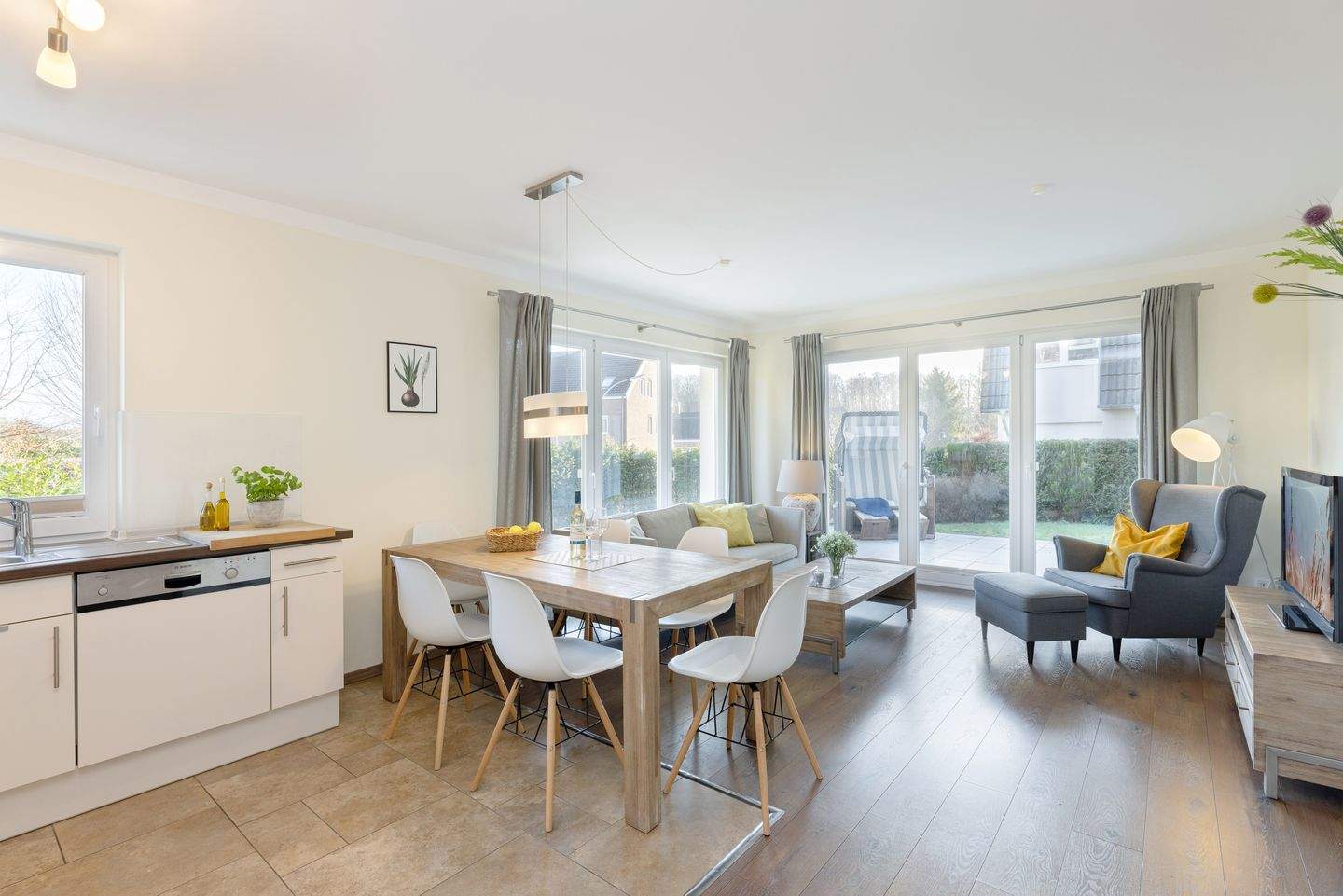 Die moderne und geschmackvolle Einrichtung zieht sich durch die komplette Wohnung. Es bietet zwei separate Schlafräume, von denen eines mit einem bequemen Doppelbett (2x 90x200 cm), zusätzlichem TV, sowie einem großen Kleiderschrank ausgestattet ist und ein weiteres Schlafzimmer mit zwei Einzelbetten (je 90x200 cm) und weiterem Kleiderschrank. Für einen erholsamen Schlaf sorgen Verdunkelungsplissees in allen Schlafräumen. Das Wellnessbad verfügt über eine Dusche und eine Badewanne - genießen Sie die Ruhe und Entspannung. Im lichtdurchfluteten Wohnraum befindet sich eine moderne gemütliche Couchgarnitur, ein DVD-Player und ein LCD-TV hier können Sie den Abend gemütlich ausklingen lassen. Die moderne, offene und im Wohnraum integrierte L-Küchenzeile ist ausgestattet mit Kühlschrank inkl. Gefrierfach, 4-Plattenceranherd, Backofen, Geschirrspüler und Kaffeemaschine. Verköstigen Sie die selbst gezauberten Speisen an dem großen für 4 Personen ausgelegten Esstisch. Also Highlight bietet die äußerst großzügige Terrasse eine schöne Ausrichtung in Richtung Sonne und verfügt über Gartenmöbel und Strandkorb.