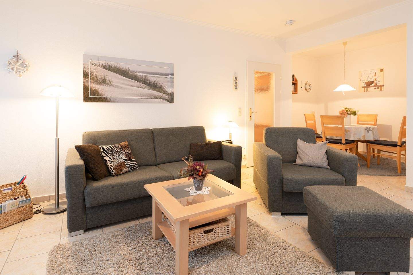 Das Ambiente des großzügigen Wohn- und Essbereichs ist luftig und hell, der Raum besticht durch moderne Gemütlichkeit und einen malerischen Blick Richtung Deich. Treten Sie vom Wohnzimmer direkt auf den möblierten Süd-Balkon, der sich über die gesamte Breite des Wohnzimmers erstreckt und genießen die herrliche Seeluft. Für Unterhaltung an Regentagen sorgt ein Flatscreen-TV, der Sofabereich bietet reichlich Platz und Komfort. Ein lauschiger Essplatz für 4 Personen im Erker ist in den Wohnbereich integriert. Das hell möblierte Schlafzimmer ist mit Doppelbett (2x 90x200 cm) und Kleiderschrank ausgestattet. Die separate Küche bietet Annehmlichkeiten wie ein Cerankochfeld, Mikrowelle und Spülmaschine. Das Badezimmer verfügt über WC, Waschtisch mit beleuchtetem Spiegel und Eckdusche. Der WLAN-Anschluss ist inklusive.