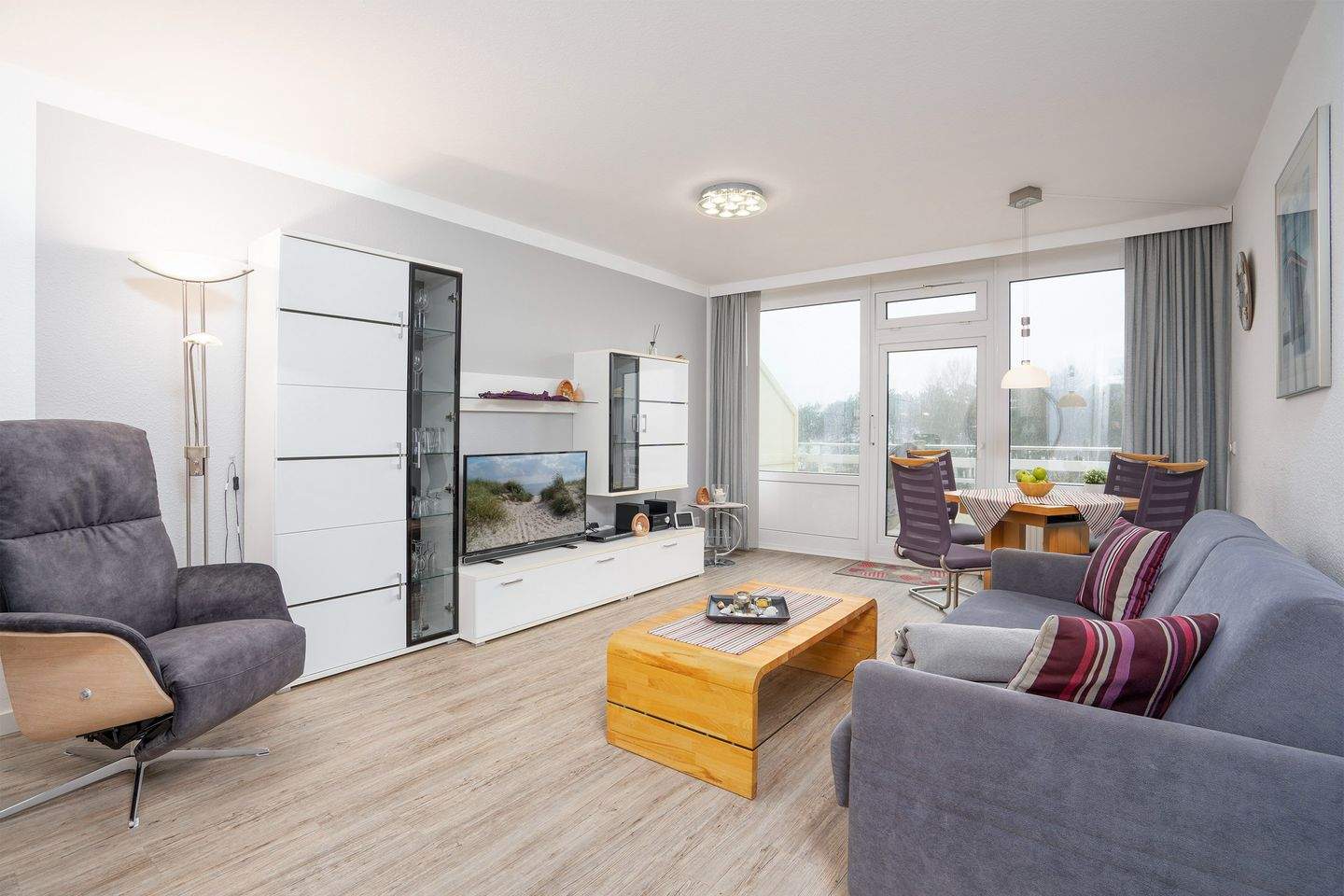 Ein geschmackvoll und gemütlich eingerichtetes Wohn-/ Esszimmer mit komfortabler Schlafcouch (in Komforthöhe, Liegefläche ca. 140x195 cm) und direktem Zugang auf den Balkon. Genießen Sie einen wunderbaren Ausblick vom möblierten und geschützten Balkon, eine ausfahrbare Markise schützt an sonnigen Tagen vor zu starker Sonneneinstrahlung.