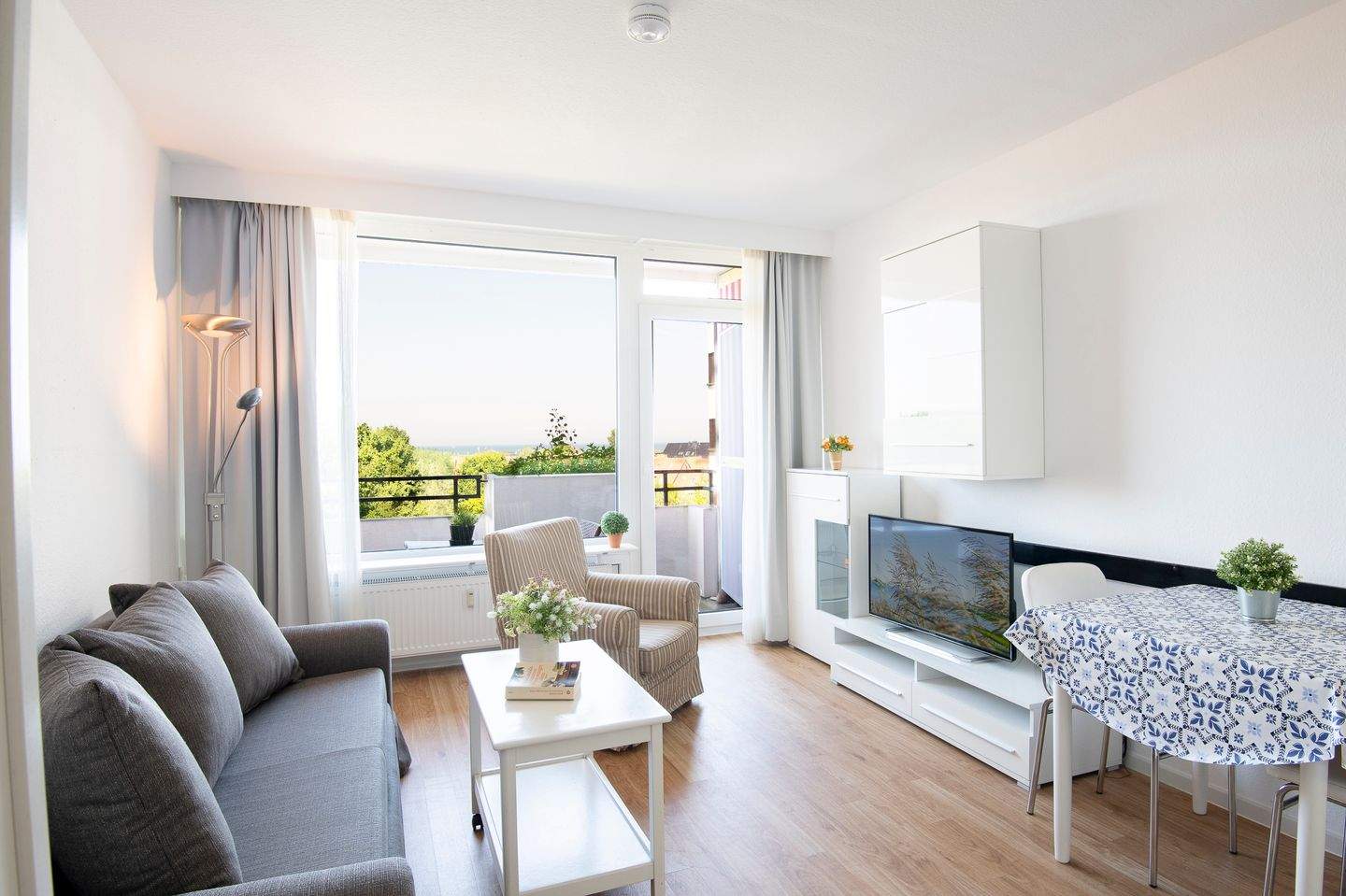 Der kombinierte Wohn- und Schlafraum ist mit einem Schlafsofa (160x200 cm), einem Sessel sowie einem SAT-TV ausgestattet. Vom Wohnbereich aus gelangen Sie auf den möblierten Balkon, der Ihnen einen fantastischen Ostsee-Fernblick bietet. Eine gut ausgestattete Pantryküche, ein Esstisch für 2 Personen, eine kleine Diele und ein innenliegendes Badezimmer mit Badewanne sind ebenfalls vorhanden. Der WLAN-Anschluss ist selbstverständlich inklusive.