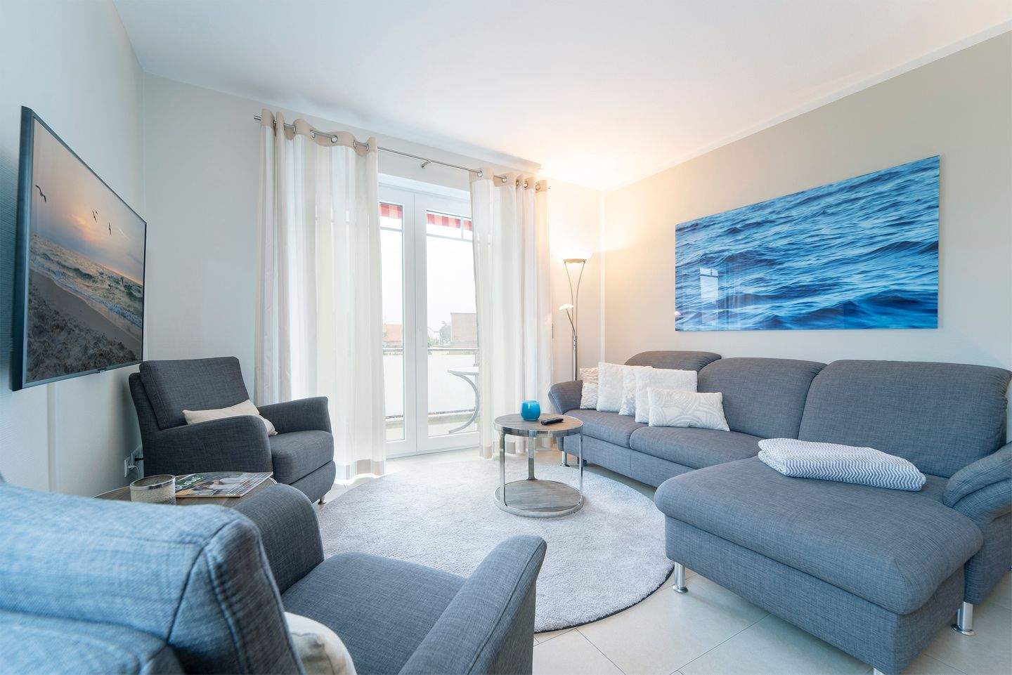 Der offene Wohnbereich empfängt Sie mit gemütlicher Sitzecke, Flat-TV, hochwertigem Essbereich und gut ausgestatteter Küche, hier ist alles harmonisch aufeinander abgestimmt! Vom Wohnbereich aus geht es direkt nach draußen auf den großen Balkon mit Süd-Ausrichtung. Ihr Balkon ist auf wertigem Niveau mit Balkonmöbeln, Sonnenliegen sowie einer Markise ausgestattet. Zwei Schlafzimmer (1 Boxspring-Doppelbett mit 180x200 cm und 1 Boxspringbett mit 160x190 cm) laden zum Entspannen und Träumen ein. In einem der Schlafzimmer gibt es einen zweiten Flachbildfernseher, sowie einen geräumigen Kleiderschrank für Ihre Urlaubsgarderobe. Ein modernes, tageslichthelles Duschbad mit ebenerdiger Dusche und komfortabler Handtuchheizung wird Sie begeistern.