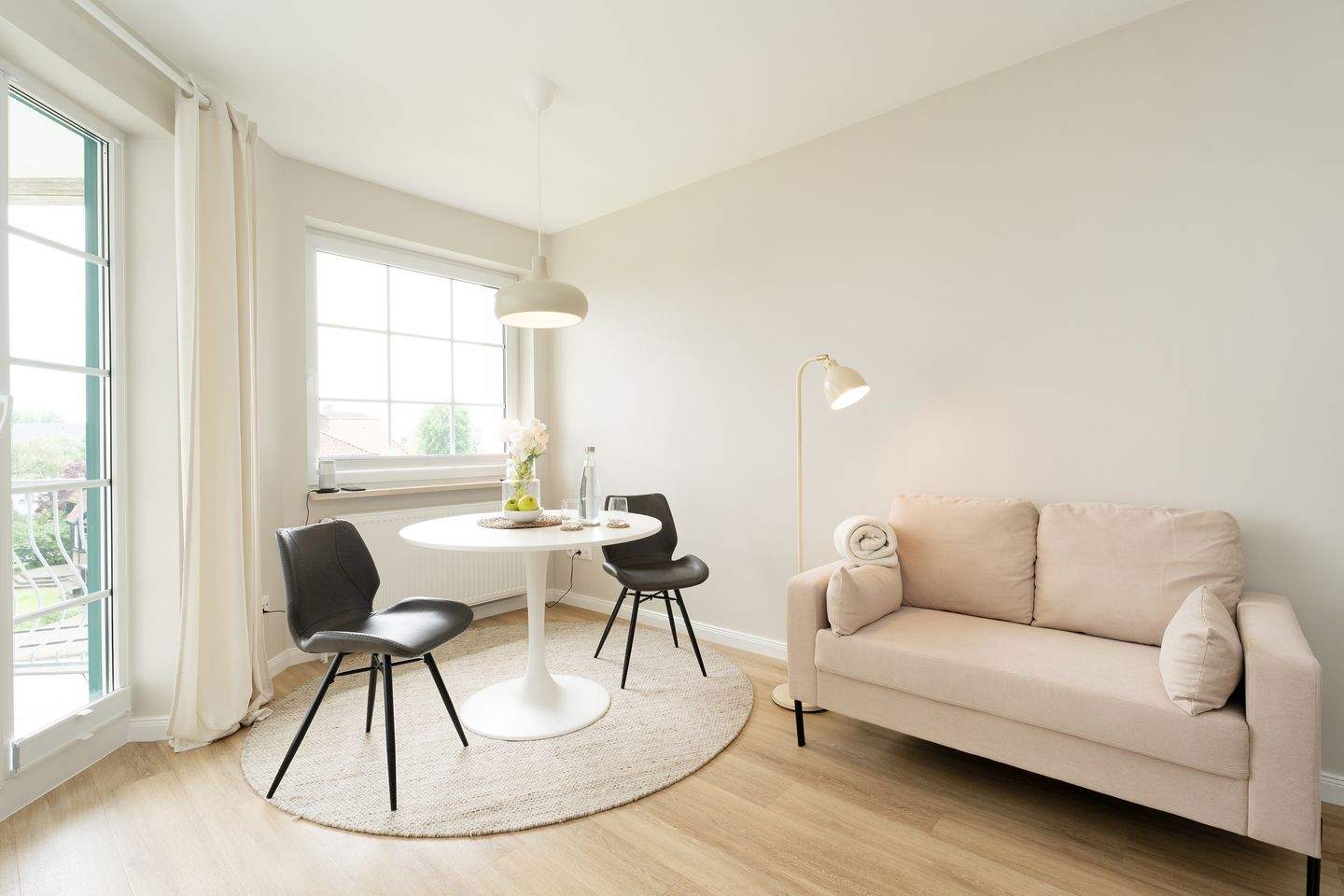Ankommen, auspacken – wohlfühlen. Diese charmante Ferienwohnung verwöhnt Sie mit einer geschmackvollen Einrichtung und einer durchdachten Raumaufteilung. Machen Sie es sich vor dem Streaming-fähigem TV-Gerät (Netflix, Amazon prime, Spotify) gemütlich oder genießen Sie das gute Wetter auf dem möblierten Balkon mit Süd-Ost-Ausrichtung. Wie wäre es dazu mit einem Snack? Die kleine, offene Küche ist zweckmäßig ausgestattet und hat zum Beispiel einen 2-Platten-Herd und einen mobilen Backofen sowie eine Nespresso-Maschine. Nach einem wundervollen Tag an der Ostseeküste werden Sie im bequemen Boxspring-Doppelbett (180x200 cm) Ihre Nachtruhe finden. Der nächste Morgen beginnt erfrischt im innenliegenden Badezimmer, das über eine bodengleiche Dusche, Föhn und Handtuchwärmer verfügt.