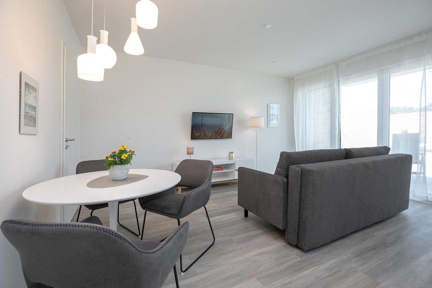 Diese 45m² große, 2-Zimmer Ferienoase mit Terrasse liegt direkt hinterm Deich und eignet sich für bis zu 4 Personen. Sie versprüht mit ihren dezenten und modernen Farben Ruhe und Entspannung. Treten Sie ein in ein großzügiges Wohnzimmer mit komfortabler Couch mit Schlaffunktion (160x200 cm), passend abgestimmter Essgruppe, Flachbildfernseher und einer offenen, voll ausgestatteten Küche der Extraklasse. Vom Wohnzimmer gelangen Sie in das Badezimmer mit großen, modernen Wandfliesen, bodentiefer Dusche und beheizbarem Handtuchhalter, sowie in das Schlafzimmer mit rückenfreundlichem Boxspring-Doppelbett (160x200 cm, durchgehender Topper) und zusätzlichem TV, welches im gleichen Stil wie das Wohnzimmer überzeugt und Ihnen geruhsame Nächte verspricht. Der große Kleiderschank erstreckt sich über die ganze Wand und bietet Ihnen für den gesamten Aufenthalt reichlich Platz für alle Urlaubsutensilien.