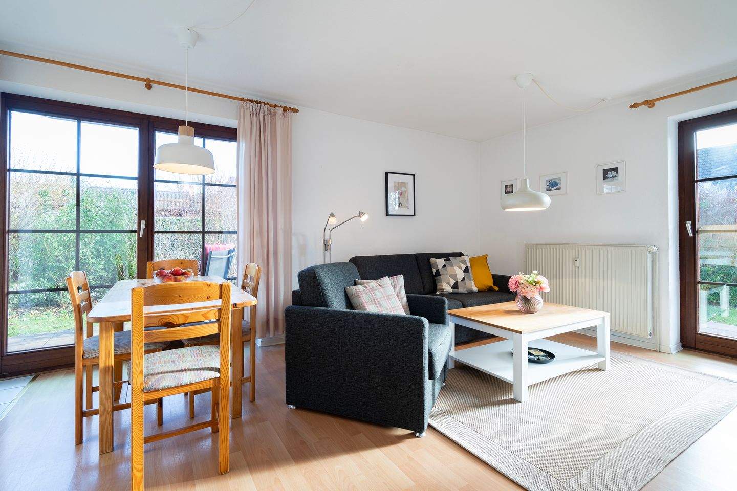 Auf ca. 38 m² können es sich max. 2 Personen entweder auf der Schlafcouch (ca. 150x200 cm) im Wohnbereich vor dem Fernseher oder im Schlafzimmer mit 2 Einzelbetten (je 90x200 cm) gemütlich machen. Die zum Wohnraum offene Küche ist komfortabel ausgestattet, Ihre zubereiteten Mahlzeiten können gleich am Esstisch einnehmen. Vom Wohnbereich aus gelangen Sie auch auf die beiden schönen Terrassen mit dem angrenzenden Gemeinschaftsgarten. Erfrischen können Sie sich unter der Dusche im kleinen innenliegenden Badezimmer.
