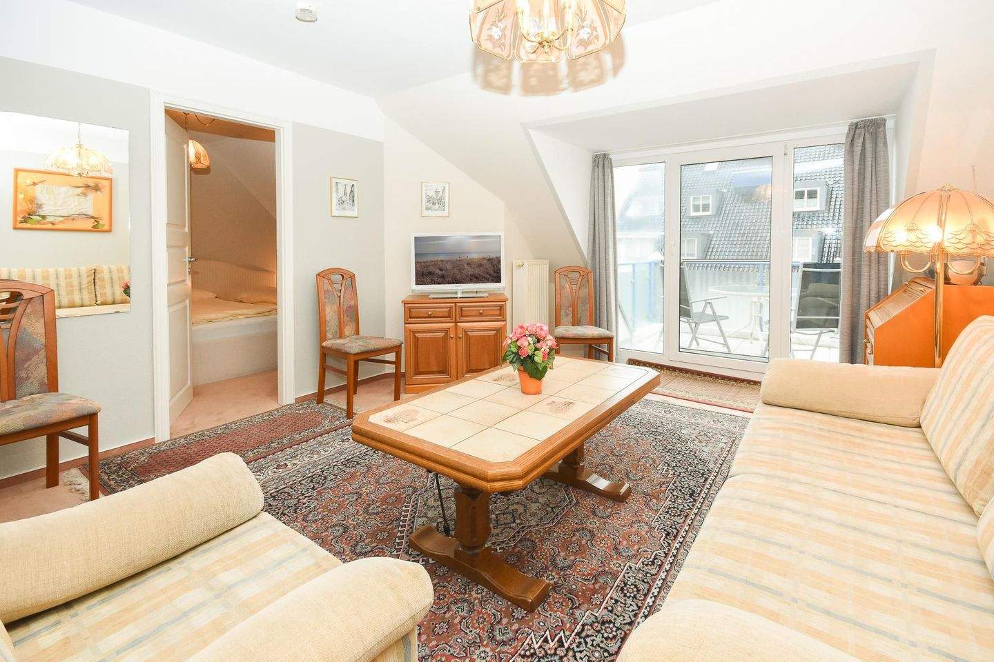 Es gibt einen Schlafraum mit einem Doppelbett (2x 90x200 cm) und ein helles Duschbad. Im Wohnraum befinden sich eine Couchgarnitur mit einem Sessel, welche zu einer weiteren Schlafgelegenheit (90x200 cm) umgewandelt werden kann, eine Musikanlage und ein TV. Die Küchenzeile ist ausgestattet mit Kühlschrank mit Gefrierfach, Geschirrspüler, 2-Plattenherd, Mikrowelle, Kaffeemaschine, Wasserkocher und Toaster. Der Couchtisch kann zum Esstisch umfunktioniert werden. Der Balkon bietet eine schöne Ausrichtung und verfügt über Gartenmöbel.