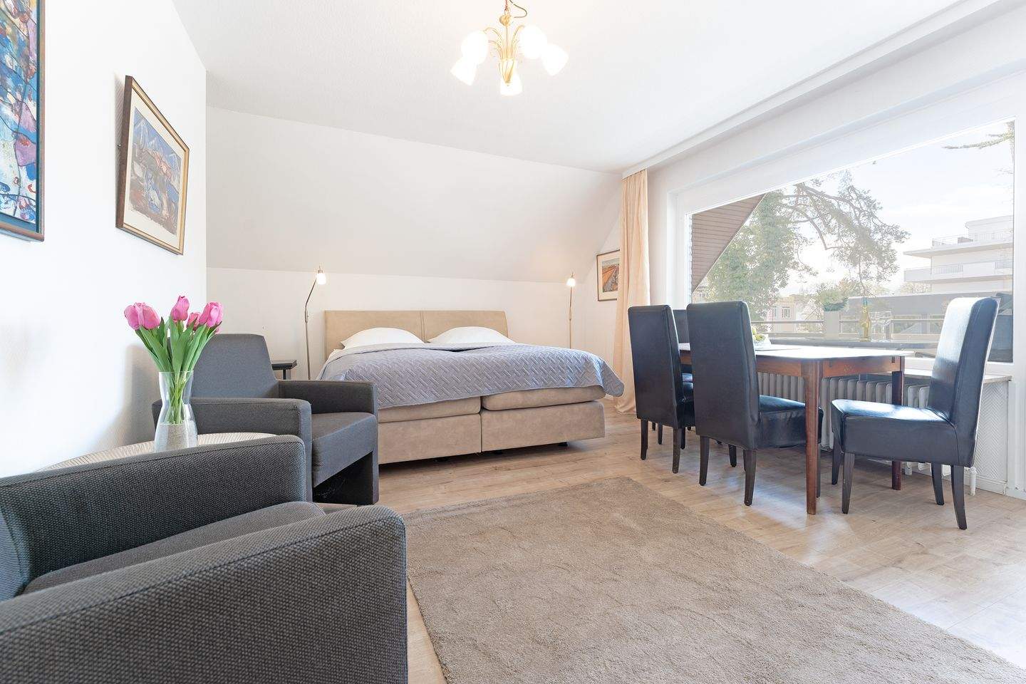 Urlaub in der 1. Reihe: Helle 2-Zimmer-Ferienwohnung in bester Lage von Timmendorfer Strand für bis zu 4 Personen im 1. Stock mit 2 Balkonen, Gemeinschaftsgarten und einer Wohnfläche von ca. 53 m².