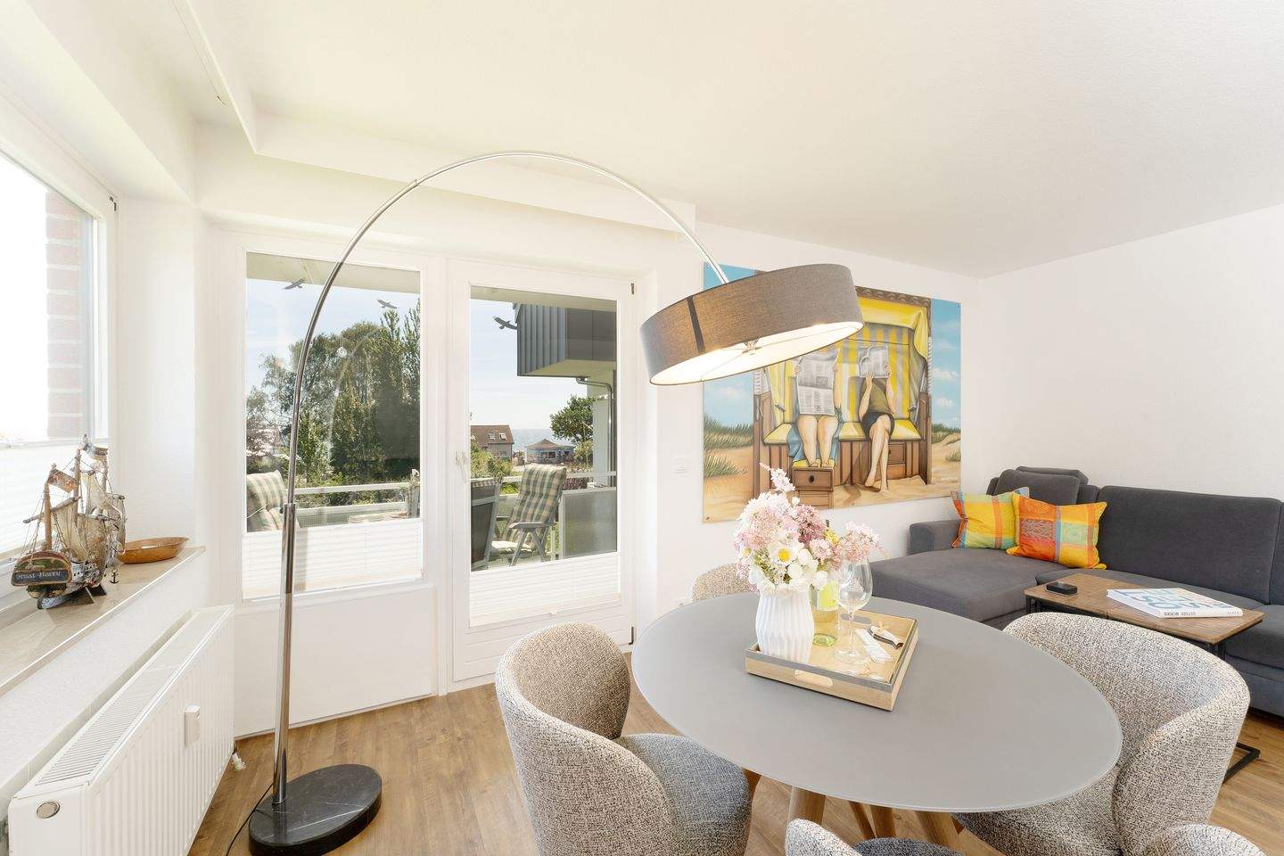Morgens vom Balkon aus die gute Seeluft genießen? Oder gleich den Tag mit einem Spaziergang am Meer starten? Die Ferienwohnung Meerträume liegt nur rund 100 Meter vom Ostseestrand entfernt und besticht nicht nur durch ihre Lage, sondern auch durch ihre schöne maritime Einrichtung. Entspannen Sie auf dem kuscheligen, meeresblauen Sofa vor dem TV oder freuen Sie sich auf dem möblierten Balkon über den Meerblick. Leckere Mahlzeiten dazu können Sie in der separaten Küche zubereiten. Die Ausstattung bietet Extras wie Espressomaschine (Nespresso) und Geschirrspüler. Vom Meer träumen werden Sie sicherlich im bequemen Doppelbett (160x200 cm) im Wohnbereich, gemütlich durch einen Raumteiler abgetrennt. Zudem steht ein Einzelbett (80x200 cm) im Schlafzimmer. Das innenliegende Duschbad mit Handtuchwärmer ist hell gefliest.