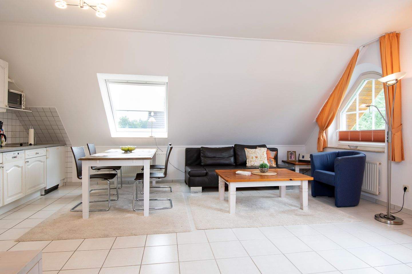 Sie betreten das Treppenhaus Ihres Feriendomizils und gelangen über eine großzügige Treppe in die 1. Etage. Ein kleiner Flur mit Abstellschrank und Garderobe empfängt Sie. Links daneben ist das hell geflieste Vollbad mit Spiegelschrank, Föhn und Fenster, geradeaus erwartet Sie das Wohnzimmer mit Zugang zum Süd-Ost Balkon und offener Küchenzeile (2-Cerankochfelder, kleiner Backofen, Mikrowelle, Kühlschrank, etc.) mit angrenzendem Essplatz. Die komfortable Ledercouch lässt sich zur Nacht zu einer weiteren Schlafgelegenheit für 2 Personen verwandeln. Über die offene Wendeltreppe mit Kindersicherungen erreichen Sie das sehr geräumige Schlafzimmer mit Doppelbett (2x90x200xcm), Kleiderschank und Recamiere. Ein Kinderreisebett kann hier ganz bequem aufgestellt werden. Die Dachschrägen geben diesem Raum eine wohlige Atmosphäre und die Nachtruhe ist durch Verdunklungsrollos gesichert. Mit einem Glas Wein kann man auf der überdachten Loggia den ereignisreichen Tag ausklingen lassen. Neben dem offenen Schlafzimmer, finden Sie auch ein hell gefliestes Duschbad mit Fenster und Föhn. Dank zweitem Badezimmer kommt es morgens nicht zu langen Wartezeiten und der Tag kann stressfrei beginnen.