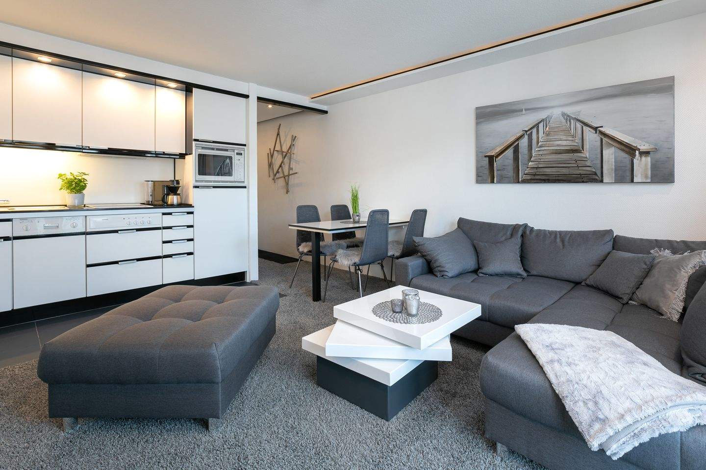 Im stimmigen, offenen Wohn- Ess- und Kochbereich kommt die ganze Familie zusammen und Sie haben ausreichend Platz zum Entspannen auf dem Sofa, gemeinsamen Essen oder Spielen. Sie entscheiden selbst, ob Sie das kulinarische Angebot der Grömitzer Gastronomie in Anspruch nehmen wollen, oder sich einfach ganz bequem in der voll ausgestatteten Küche selbst verpflegen. Auch auf dem Balkon findet jeder ein lauschiges Plätzchen - Mama und Papa können den Tag bei einem guten Glas Wein Revue passieren lassen, während die Kleinen sich mit einem spannenden Buch auf das Loungesofa kuscheln können. Das Elternschlafzimmer wartet dann mit einem gemütlichen Doppelbett (2x 90x190 cm), großem Kleiderschrank und eigenem TV darauf, Ihnen traumhafte Nächte zu bescheren. Gleich nebenan wird das stylische Etagenbett (unten 100x200 cm, oben 90x200 cm) die Augen Ihrer Kinder zum Leuchten bringen. In dem hochwertig ausgestatteten Badezimmer werden Sie nach einer ausgiebigen Dusche erfrischt in einen neuen Urlaubstag starten.