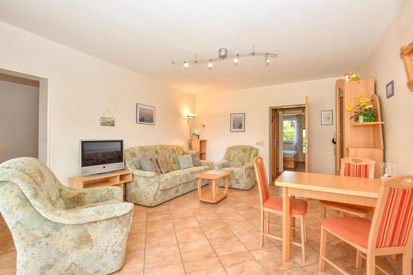 Durch einen kleinen Flur gelangen Sie zum einen in das liebevoll gestaltete Schlafzimmer, ausgestattet mit einem Doppelbett und einem geräumigen Kleiderschrank. Dieses Schlafzimmer (2x 90x200 cm) liegt nach vorne, getrennt durch einen kleinen Vorgarten zur verkehrsberuhigten Straßenseite. Auch das Bad und der Zugang zum Wohnzimmer gehen vom Flur ab. Die gesamte Wohnung ist in einer warmen Naturfarbe gefliest, eine Fußbodenheizung sorgt für wohlige Wärme. Das Duschbad präsentiert sich hell und freundlich, hier lässt es sich bestens in den Tag starten. Das behagliche Wohnzimmer bietet genug Platz für gemütliche Abende mit bis zu vier Personen. Für Ihre Unterhaltung sorgt hier ein Flachbildfernseher, sowie eine Musikanlage. Selbstverständlich ist Ihr Domizil auch mit WLAN ausgestattet.