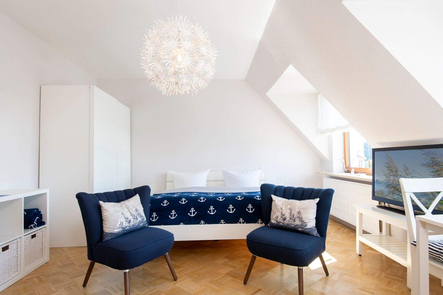 Treten Sie ein in den hellen, modern eingerichteten Wohn- und Schlafraum. Ihre Jacken können Sie direkt an der Garderobe aufhängen und für Ihr Urlaubsgepäck steht ein Kleiderschrank bereit. Den Mittelpunkt dieser Wohnung stellt der kombinierte Wohn- und Schlafbereich mit einem Doppelbett (2x 90x200 cm), zwei Sesseln, einem Flachbildfernseher sowie einem Esstisch mit Platz für 2 Personen dar. Die kleine, separate Küche mit hellen Fronten ist z. B. mit einem Backofen, einem 2-Platten-Cerankochfeld, einem Kühlschrank und einem Geschirrspüler gut ausgestattet. Im hell gefliesten Badezimmer erwartet Sie neben dem WC und der Dusche ein großer Wandspiegel, ein beheizbarer Handtuchhalter sowie Stauraum für Ihre Badutensilien. Der Wohn- und Schlafraum lässt sich zur Nacht mit Außenrollläden angenehm verdunkeln. Der WLAN-Anschluss ist für Sie selbstverständlich inklusive.