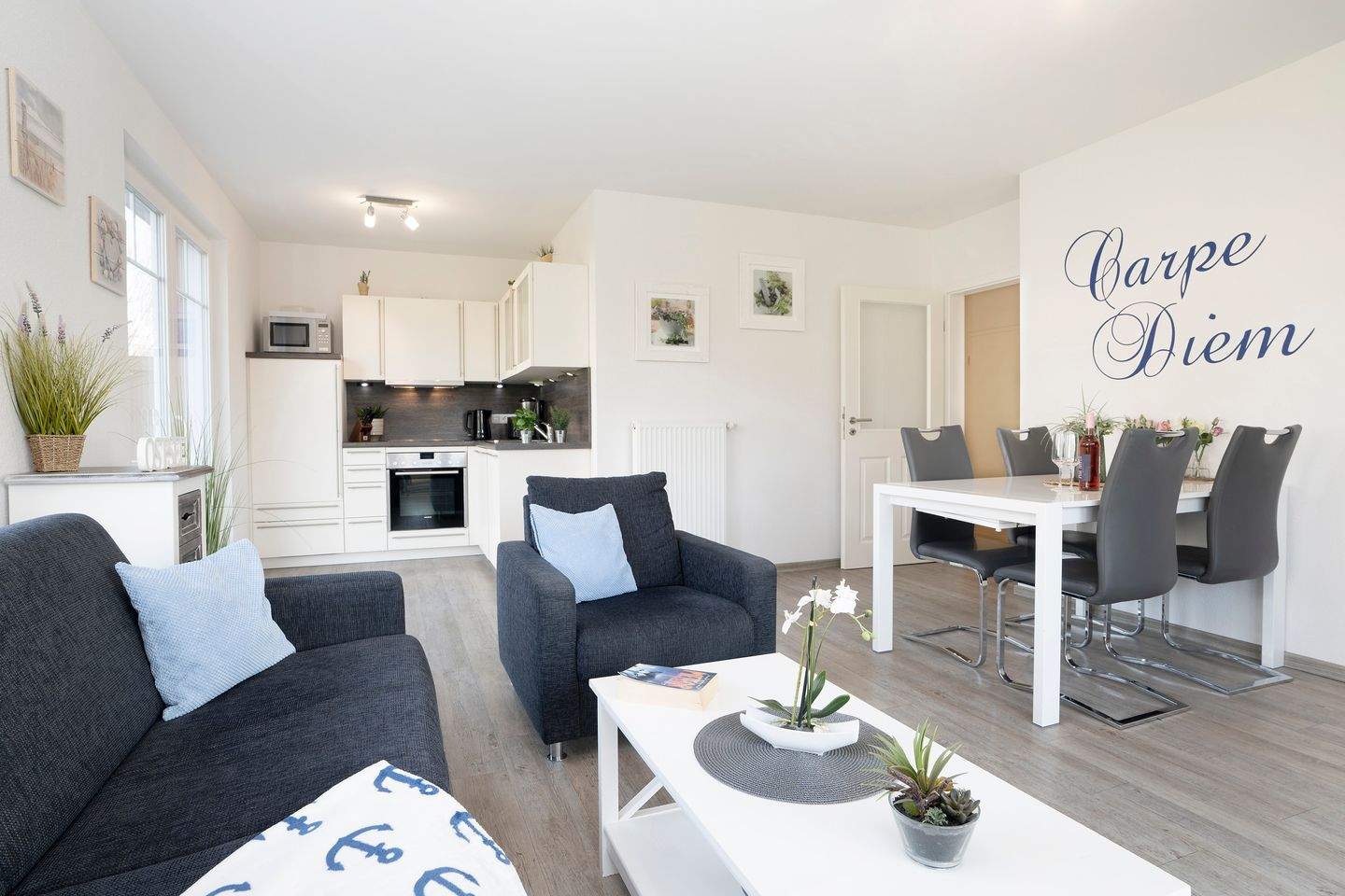 Diese top Erdgeschoss-Wohnung (ca. 45 m²) wird Sie begeistern. Ein modernes ruhiges Schlafzimmer mit neuen, weichen Matratzen (2x 100x200 cm) und Flat-TV, ein harmonisches Wohnzimmer mit zusätzlicher Schlafcouch (160x190 cm) und Flat-TV, sowie die Küche mit 4-Platten Ceranfeld, Spülmaschine und diversen Extras lassen ebenso keine Wünsche offen, wie das ansprechende Bad mit ebenerdiger Dusche und Radio. Die großzügige Terrasse (ca. 40 m²) ist mit hochwertigen Gartenmöbeln inkl. Liege ausgestattet. In der kompletten Wohnung ist Fußbodenheizung.