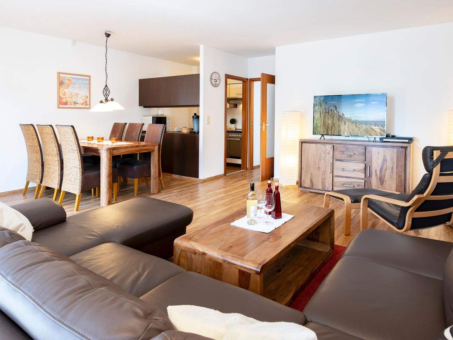 Ein einladender Wohn- und Essbereich heißt Sie in dieser Wohnung willkommen. Das lichtdurchflutetes Wohnzimmer mit Smart-TV und CD-Player lädt Sie ein, den Abend nach einem langen Strandtag ganz gemütlich ausklingen zu lassen. Treten Sie von hier aus auf den sonnigen Balkon, auf dem Sie die Meeresluft schon in den ersten Sonnenstunden des Tages genießen können. Die im Wohnzimmer integrierte Küche ist mit Kühlschrank, Gefrierfach, Backofen, Mikrowelle, Kaffeemaschine und Spülmaschine voll ausgestattet und lässt keine Wünsche offen. Im Elternschlafzimmer mit komfortablem Doppelbett (2x 90x200 cm) steht ein großer Kleiderschrank für Ihre Urlaubsbekleidung bereit. Für geruhsame Nächte befinden sich Außenrollläden an den Fenstern, ebenso im Kinderzimmer, welches mit 2 Einzelbetten (je 90x200 cm) und Kommode ausgestattet ist. Und auch im Badezimmer fehlt es Ihnen an nichts. Fußbodenheizung und ein beheizbarer Handtuchhalter sorgen für reichlich Komfort.
