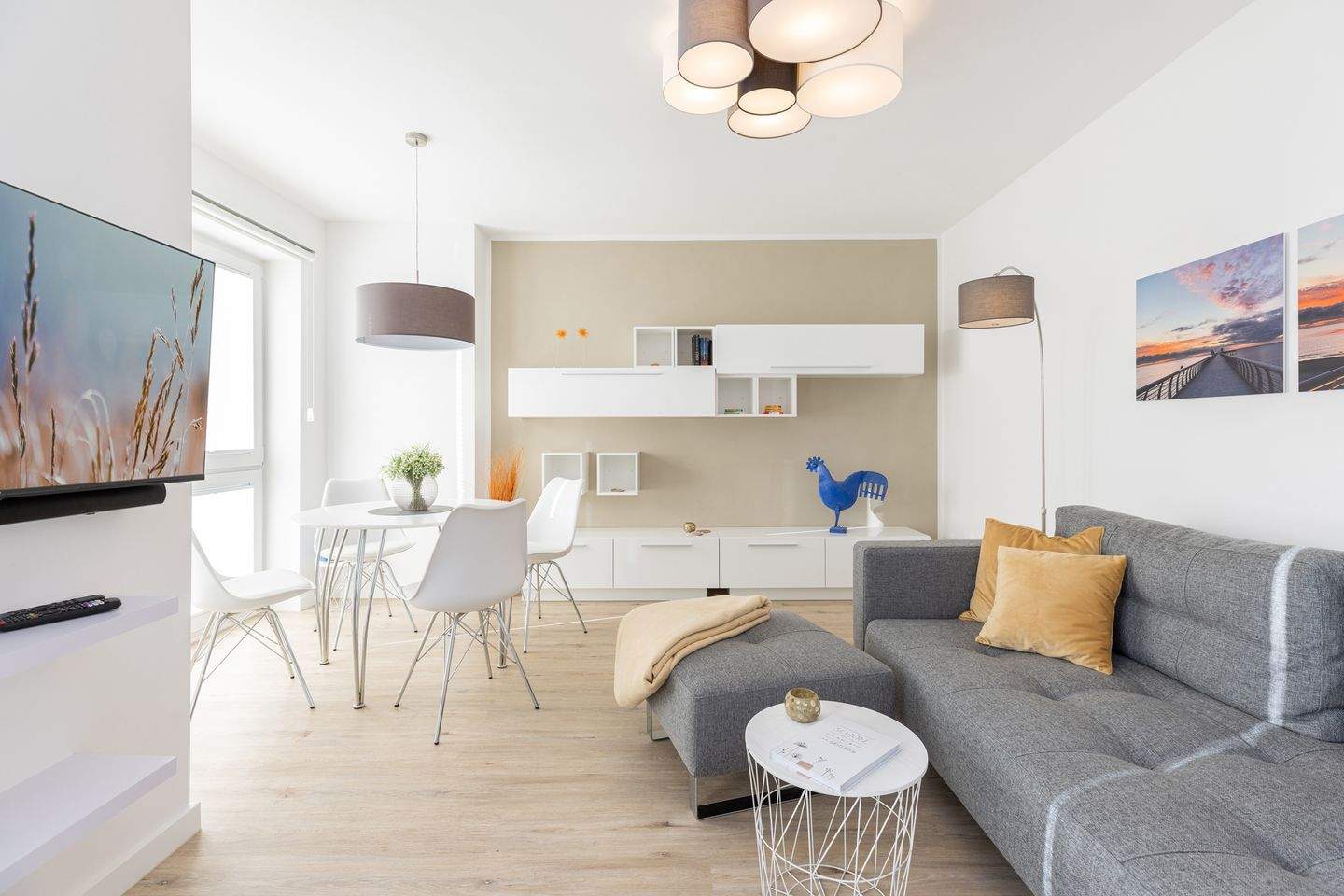 Ein stilvoll eingerichteter Wohnbereich erwartet Sie mit einem komfortablen Ecksofa, einem Flachbildfernseher, Bluetooth-Audiobox sowie einem runden Esstisch direkt am Fenster. Das Sofa dient gleichzeitig als Schlafmöglichkeit (160x200 cm), Blickschutz-Plissees mit Sonnenreflektoren sorgen für erholsame Nächte. Die moderne, voll ausgestattete Küche grenzt offen an den Wohnbereich und lädt zu geselligen Abenden ein. Das separate Schlafzimmer ist mit einem Boxspring-Doppelbett (2x 90x200 cm, durchgehender Topper), einem weiteren Fernseher sowie Verdunkelungsplissees ausgestattet. Das innenliegende Badezimmer wird Sie mit einer bodengleichen Dusche, einem beheizbaren Handtuchhalter sowie Fußbodenheizung begeistern. Erholen Sie sich auf dem möblierten Balkon mit Süd-Ausrichtung vom Alltag.