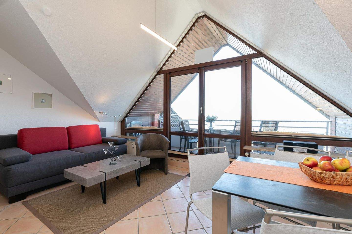 Im Wohnraum befinden sich eine Couchgarnitur mit Sessel, welche zu einem Doppelbett (150x200 cm) ausgezogen werden kann, eine Musikanlage und ein großer LED- TV. Die Küchenzeile ist ausgestattet mit Kühlschrank mit Gefrierfach, 2-Plattenceranherd, Backofen, Geschirrspüler, Kaffeemaschine, Wasserkocher und Toaster. Der Wohnraum verfügt über einen Esstisch. Der möblierte Balkon bietet einen wunderschönen Meerblick. Zudem gibt einen Schlafraum mit einem Doppelbett (2x 90x200 cm).