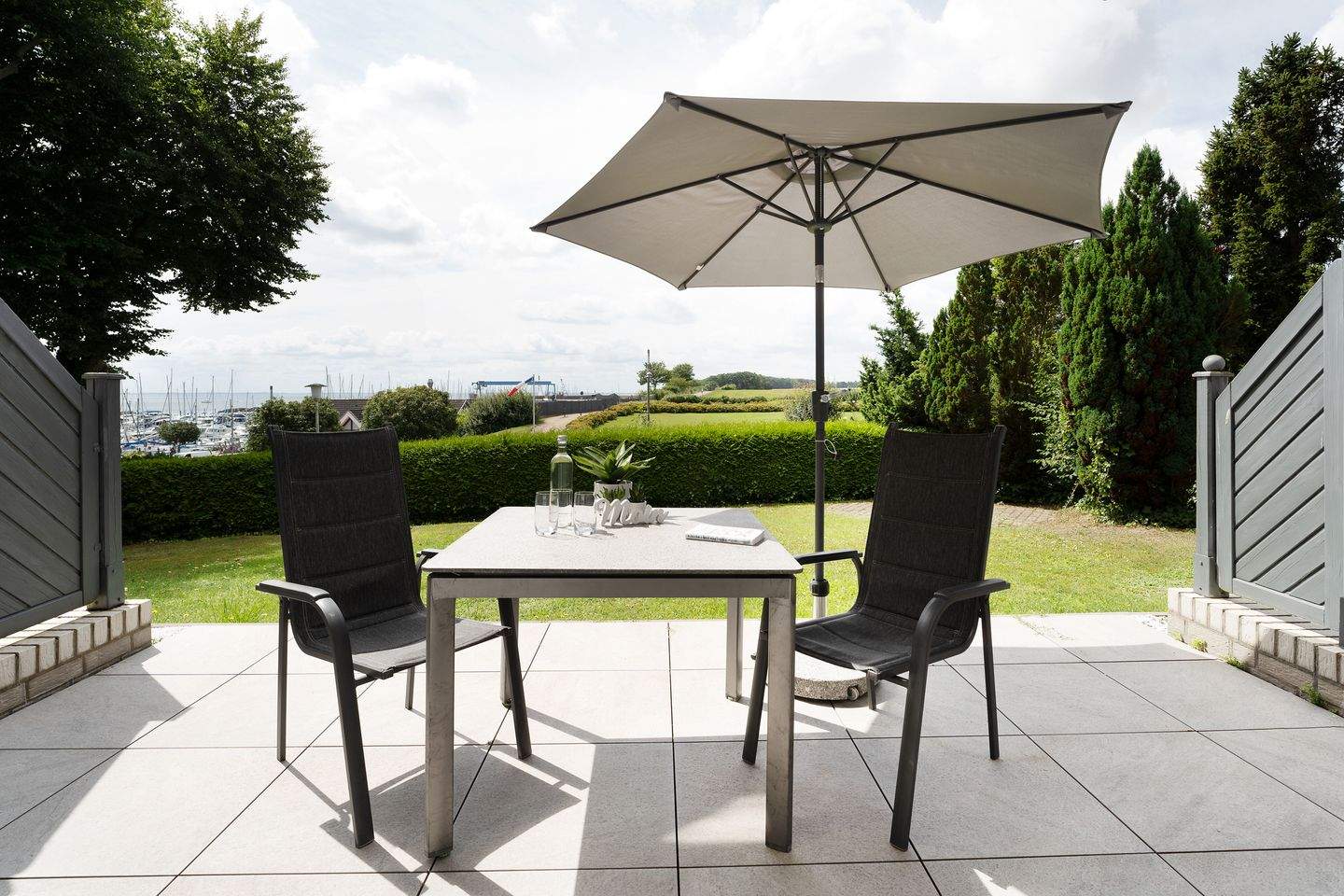 Im hellen Wohnbereich lädt das gemütliche Sofa zu Fernsehstunden vor dem UHD-Smart-TV ein. Auch Musikfans können sich freuen, denn eine Stereoanlage gehört ebenfalls zur Grundausstattung. Das Sofa bietet bei Bedarf ausreichend Platz (160x200 cm) als 3. Schlafmöglichkeit. Tolle Gerichte lassen sich in der offen gestalteten Küche zubereiten, die mit allen Annehmlichkeiten ausgestattet ist. Für den besonderen Kaffeegenuss steht sogar eine Nespresso-Maschine bereit. Der gleich angrenzende Esstisch bietet sich perfekt an für gemeinsames Essen, Spiele-Abende oder einfach nur zum Klönen. Vom Wohnbereich aus gelangt man auf die möblierte Südwest-Terrasse mit Blick auf den schönen Yachthafen. Hier können Sie ungestörte Urlaubsstunden verbringen, sonnenbaden und entspannen. Im separaten Schlafzimmer mit Komfort-Boxspring-Bett (2x90x200 cm) lässt es sich hervorragend schlafen und Sie können ausgeruht und frisch in den neuen Tag starten. Das moderne Duschbad ist mit praktischer Handtuchheizung ausgestattet. Ein WLAN-Anschluss ist inklusive.