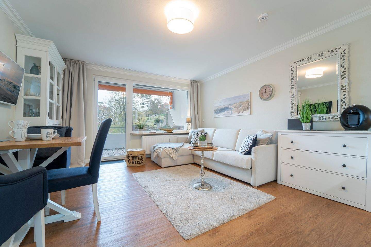 Von Ihrem ruhig gelegenen, in südwestlicher Richtung ausgerichtetem Balkon, haben Sie einen traumhaften Blick ins Grüne und hinter den Baumwipfeln erahnen Sie die naheliegende Ostsee und den Grömitzer Yachthafen. Frische Seeluft ist hier garantiert!